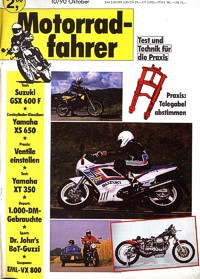 | Zwischenbericht zum Langstreckentest: Ducati 907, Honda CBR 1000 F, Yamaha XTZ 660, Suzuki DR Big 800 S, Suzuki VX 800, BMW K1, Gilera RC 600 | 1991 07 S. 38 | |
