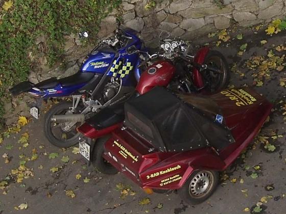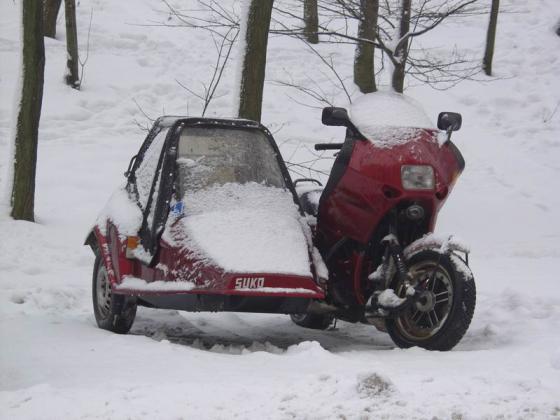 Baujahr 1993 | 90000 km | Walter-Gespannumbau mit Jeaniel Condor (2-sitzer), 4-Personen-Zulassung, Vorderrad-Schwinge (Jeaniel-Walter), vorn 135/70-15, hinten 165/65-14, Seite 135-13, 350-700 kg Masse, ca. 1,85 m breit, Autobatterie im Kofferraum, 2-in-1 links (BSM), Windschild (im Bild noch mit Pichler-Verkleidung)
