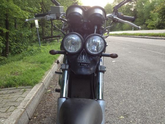 Baujahr 1990 | 85000 km | Wirth Federn, Miniblinker schwarz, Doppelscheinwerfer schwarz, schwarze Skull-Spiegel, schwarz matt. Touring Sitzbank, Skull-Front
