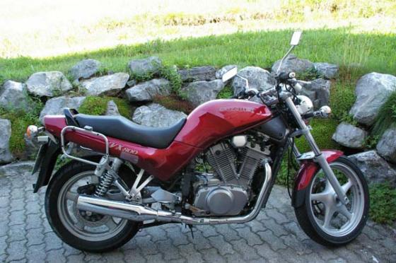 White Power Federn, Fivestar Kofferhalter mit Givikoffern, Stahlflex, Bridgestone BT 45 (super), meine Dicke braucht jetzt mal einen neuen Anstrich, die Sonne hat die Pigmente gefressen!