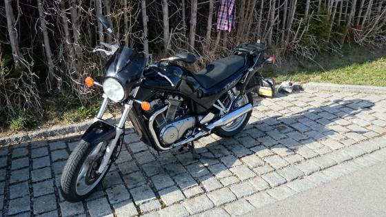 Farbsatz geändert von lila auf schwarz (Seitenverkleidung, Tank (neu versiegelt mit Kreem 2K), Benzinhahn Abdeckung), Gel Sitzbank neu gesattelt (Foto folgt), PUIG Windy Windschutzscheibe, SHARK Spiegel, Five Stars Seitenträger (vorher Givi Wingrack), für große Strecken mit zwei Kappa K40 Monokey Seitenkoffern unterwegs, Tecnoparts Gel Batterie (12V/14Ah), Klarglasscheinwerfer Umbau (Shin-Yo asymmetrisch), USB Anschluss an linker Rahmenverkleidung, Mini Blinker, Alu Kühlgitter