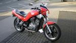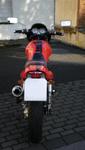 Cockpit-Verkleidung von Puig, BOS 2in1-Auspuffanlage, Bugspoiler von Pfepper,Stahlflex-Bremsleitungen von Spiegler, Sonderlack orange mit schwarzem Streifen, Miniblinker, Felgen lackiert und poliert
