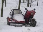 Walter-Gespannumbau mit Jeaniel Condor (2-sitzer), 4-Personen-Zulassung, Vorderrad-Schwinge (Jeaniel-Walter), vorn 135/70-15, hinten 165/65-14, Seite 135-13, 350-700 kg Masse, ca. 1,85 m breit, Autobatterie im Kofferraum, 2-in-1 links (BSM), Windschild (im Bild noch mit Pichler-Verkleidung)