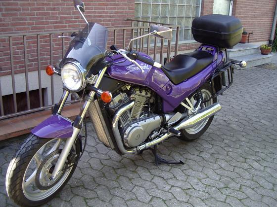Kühlergrillverkleidung, Lenkkopfverkleidung und Gabelstabilisator aus V2A, kl.Scheibe, Topcase und Koffersatz, Koni-Dämpfer/ Heizgriffe, Ölthermometer, Rücklicht - Umbau auf LED´s Neue Lackierung