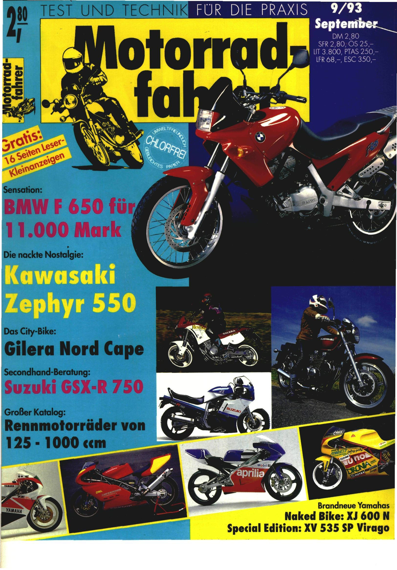 | Zwischenbericht zum Langstreckentest: Ducati 907, Honda CBR 1000 F, Yamaha XTZ 660, Suzuki DR Big 800 S, Suzuki VX 800, BMW K1, Gilera RC 600 | 1991 07 S. 38 | |