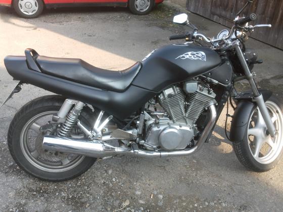 Baujahr 1990 | 85000 km | Wirth Federn, Miniblinker schwarz, Doppelscheinwerfer schwarz, schwarze Skull-Spiegel, schwarz matt. Touring Sitzbank, Skull-Front