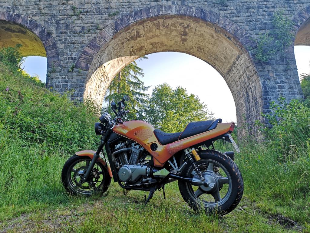 Baujahr 1995 | 88000 km | Motor komplett überholt (inkl geänderter Kettenspanner, Zündzeitpunkt geändert, Hauptdüsen geändert), Alu-Motorhalter, Auspuff Eigenbau, LSL Lenker(Griffe mit VX-Beschriftung), YSS-Gabelventile, Standrohre DLC-Beschichtet, VMax-Fender vorn, Öhlins-Federbeine hinten, LED-Scheinwerfer, Batteriekasten Kunststoff-Eigenbau, Sitzbank aufgepolstert(mit Gel), neu bezogen, mit Sitzheizung, Felgen/Motor und Kleinteile in Magnesio Metallic lackiert, viel kleine Gewichtseinsparungen
