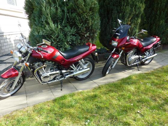 ´94er: - verchromte Motorseitendeckel - Stahlflex Bremsschläuche - selbst hergestellte Edelstahlteile an verschiedenen Stellen - 2-klang-Hupen vor dem Kühlergrill - Edelstahlkühlergrill ´96er: - FiveStar - Halbschale - Nonfango Kofferhalter mit Originalfarbe lackierte Seitenkoffer - kleine Halogenblinker vorn & hinten - Aplikationen in Messing/Chrom (Gabelbrücke ...) - 2-klang-Hupen unter der Verkleidung (ca. 130db/1m) ;-) - Edelstahlkühlergrill mit Aplikation und viele viele weiere Kleinigkeiten überall an den Maschinen ... ;-)