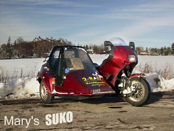 Walter-Gespannumbau mit Jeaniel Condor (2-sitzer), 4-Personen-Zulassung, Vorderrad-Schwinge (Jeaniel-Walter), vorn 135/70-15, hinten 165/65-14, Seite 135-13, 350-700 kg Masse, ca. 1,85 m breit, Autobatterie im Kofferraum, 2-in-1 links (BSM), Windschild (im Bild noch mit Pichler-Verkleidung)